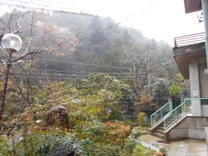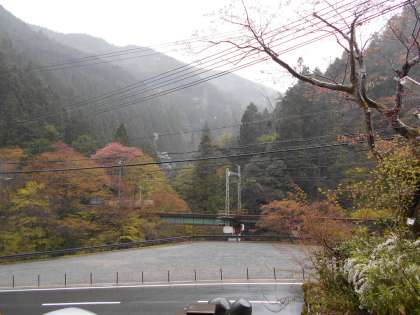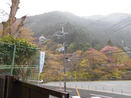 街道沿いの桜は散っていますが,山々の上部の山桜はまだ満開に見えます。