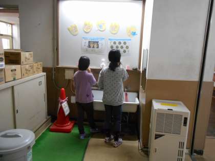 楽しい給食の後,順々に“食後の歯磨き”をしています。