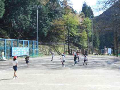 晴れの運動場で楽しんでいます。
