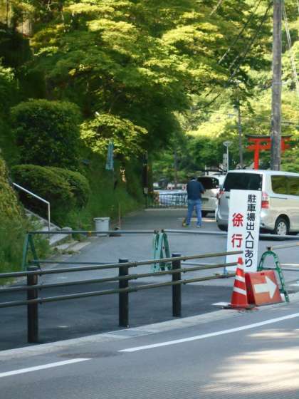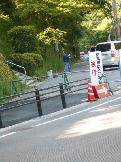 石段付近の清掃を,管理用務員さんがしています。