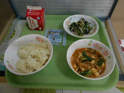 今日の給食は,麦ごはん・牛乳・とうふの四川風・ほうれん草ともやしのいためナムル・じゃこです。