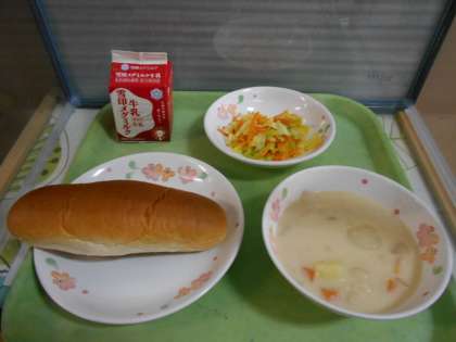 今日の給食は,味つけコッペパン・牛乳・手亡豆のクリームシチュー・野菜のソテーです。