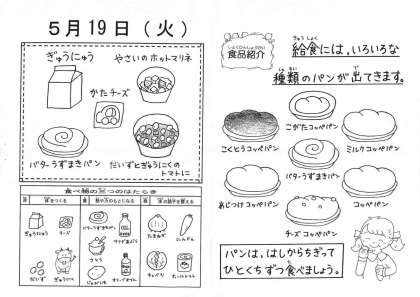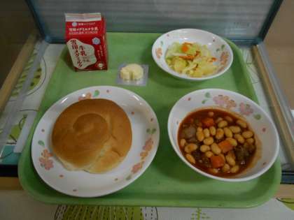 今日の給食は,バター渦巻パン・牛乳・大豆と牛肉のトマト煮・野菜のホットマリネ・チーズです。