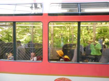 車窓から手を振る児童,じゃんけんをしているように見えます。
