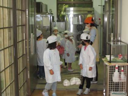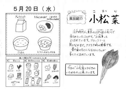 給食室の配膳見本は,教室の「給食カレンダー」と同じ並べ方になっています。