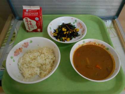 今日の給食は,麦ごはん・牛乳・カレー・ひじきのソテーです。