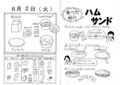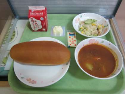 今日の給食は,コッペパン・牛乳・ハムサンド(具)・トマトシチュー・チーズです。