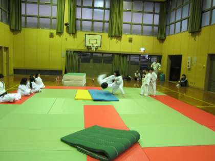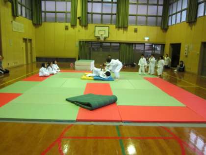 体落としの練習です。先生や先輩のお手本を,しっかり見て覚えましょうね。
