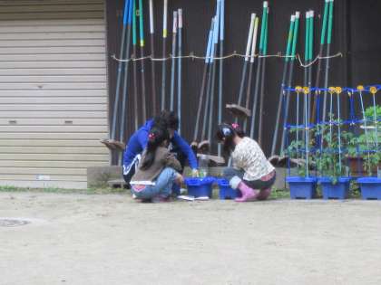 1年生がアサガオの観察をしています。