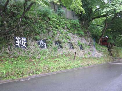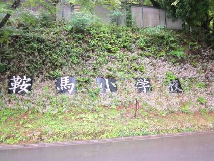 画像は【鞍馬小学校】の看板です。朝露のユキノシタと一緒になって,輝いて見えます。