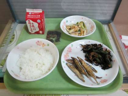 今日の給食は,ごはん・牛乳・きつね丼(具)・きびなごのからあげ・ひじきの五目煮です。丼には〖きざみのり〗をかけていただきます。