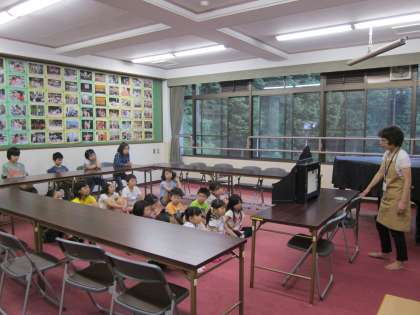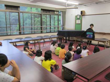 川島先生による読み聞かせ,今日は紙芝居です。みんな真剣に聞いています。