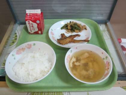 今日の給食は,ごはん・牛乳・はたはたのこはくあげ・伏見とうがらしのおかか煮・もずくのみそ汁です。
