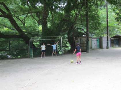 いつも涼しい鞍馬小学校ですが,さすがに今日は30度まで気温が上がっています。鞍馬っ子はムクの木の下でPK対決です。