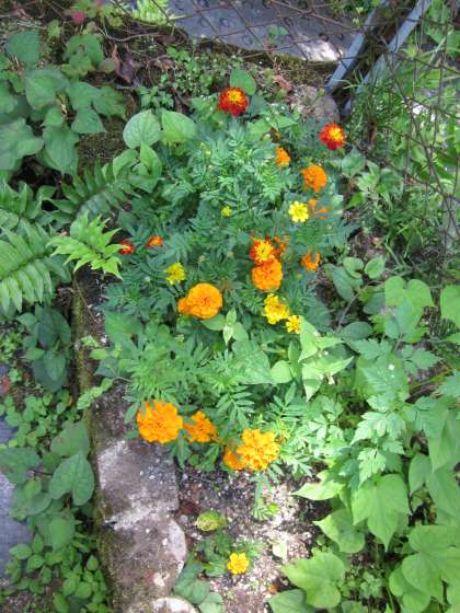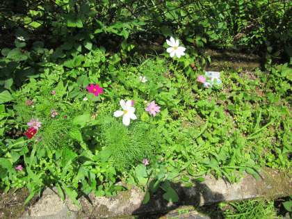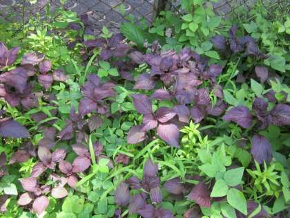色とりどりの草花が,さりげなく咲いています。紫蘇の葉っぱもいい色です。