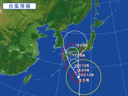 大型で非常に強い台風11号は,16日夜に西日本太平洋側に接近し,17日にかけて上陸するおそれがあります。