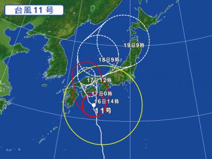 大型で強い台風11号の接近に伴い,明日17日にかけて,西日本の太平洋側を中心に猛烈な風が吹き,海上は猛烈にしけるでしょう。暴風や高波に厳重に警戒してください。また、西日本や東日本の太平洋側を中心に広い範囲で大雨となる見込みです。高潮にも警戒が必要です。