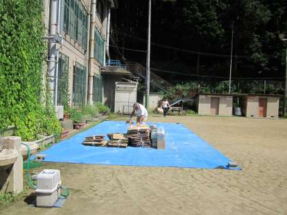 午後の作業中は,みんな汗だくになって整備しました。