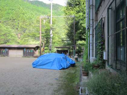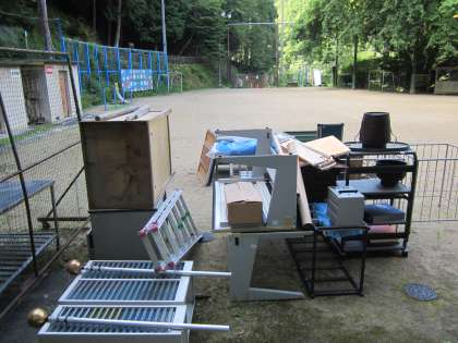 業者の方がトラックで回収してくれるまで,しばらく運動場に保管しています。(濡れて困るものはシートで被いました。)