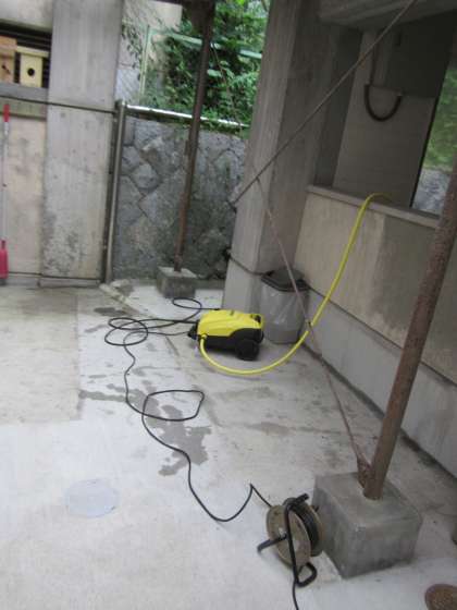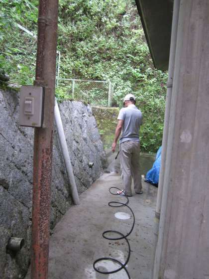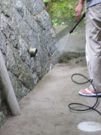 教頭先生が高圧洗浄機で,壁の苔を落としています。