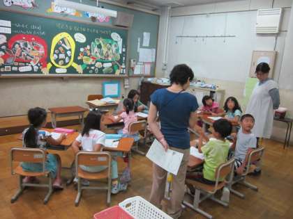 本日,教育委員会から,小川初美専門主事にお越しいただきました。1・2年生に『食』についての授業をしていただきました。
