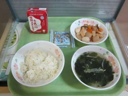 今日の給食は,麦ごはん・牛乳・プリプリ中華いため・わかめスープ・じゃこです。