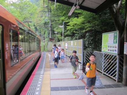 朝,貴船口駅での様子です。カップの中にはカマキリが…。