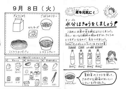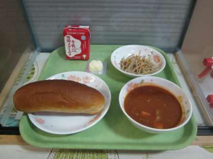 今日の給食は,黒糖コッペパン・牛乳・トマトシチュー・ごぼうのソテー・チーズです。ごぼうはよく噛んでいただきましょう。