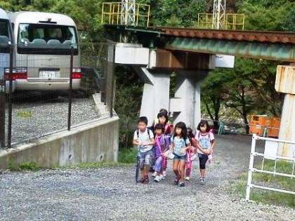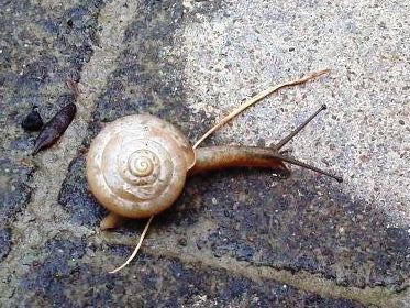 子どもたちが橋のところで,何かを避けて歩いているので,近づいてみると,カタツムリがお散歩中でした。