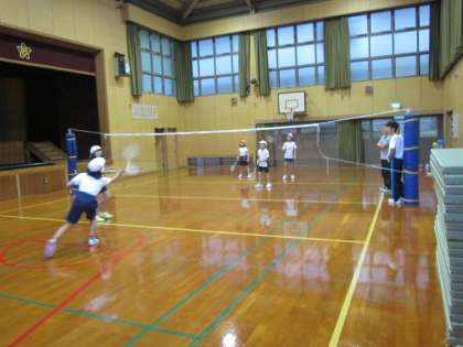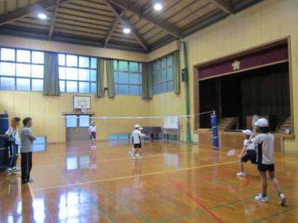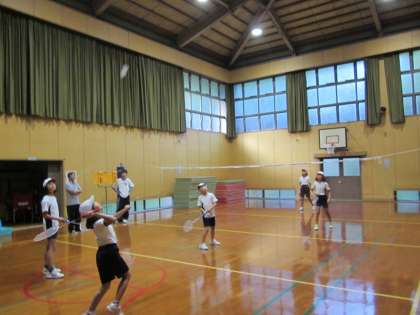 体育館でバドミントンです。打つタイミングが独特ですね。
