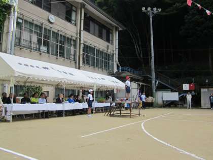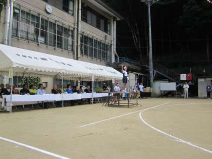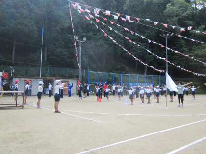 紅白の5年生児童代表が,朝礼台でコールしました。