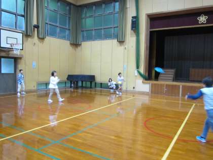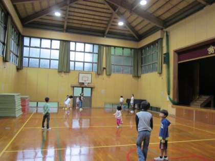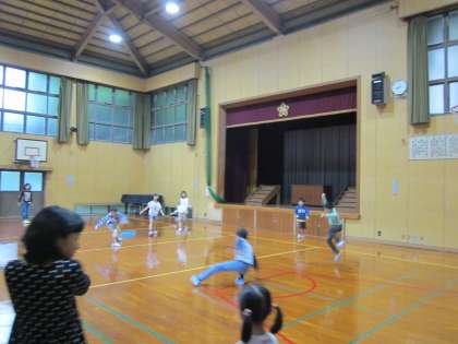 グランドが濡れています。遊びは体育館です。