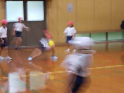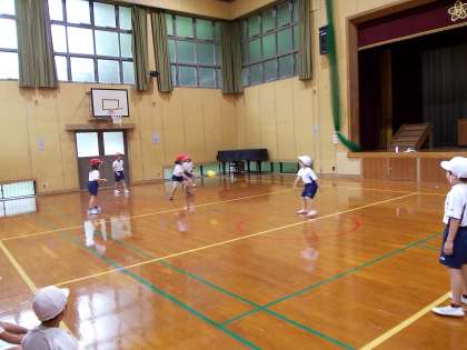 今日は黄色の柔らかいボールを使って,ボールゲームをしています。
