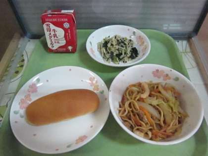 今日の給食は,小型コッペパン・牛乳・ソース焼きそば・切干大根の炒めナムルです。焼きそば好きな児童が多いです。