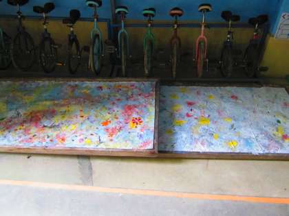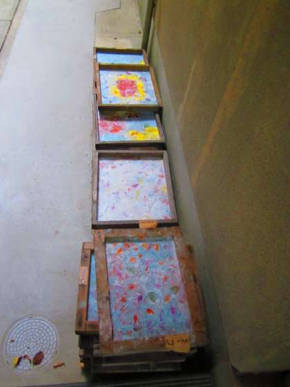 体育館前に,昨日の【紙漉き作品】を運んでいただいています。今日か明日,皆ではがす予定でいます。