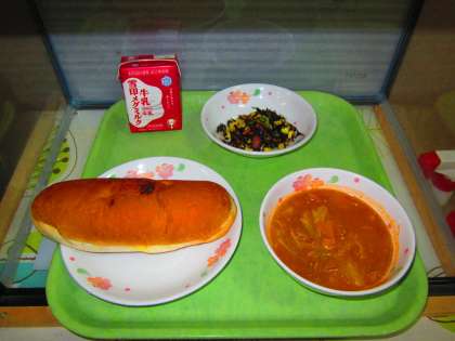 今日の給食は,チーズコッペパン・牛乳・ボルシチ(ウクライナ料理)・ひじきのソテーです。