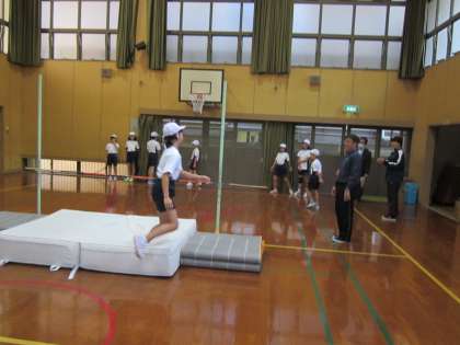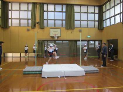 昔は砂場で,今はウレタンマットで行います。自分の記録を覚えておきましょうね。