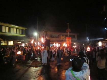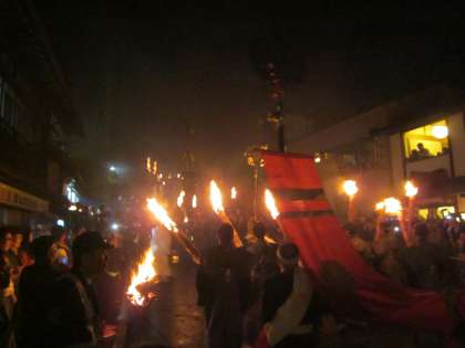 鉦や太鼓の音が聞こえてきました。松明と共に,鉾も山門下に集合してきました。
