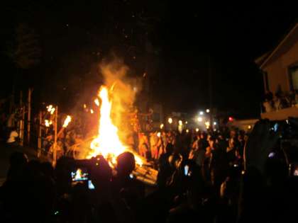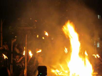 石段を神輿が降ります。男性が担ぎ棒にぶら下がり,『チョッペン』という儀式をされると,大きな拍手がおこりました。
