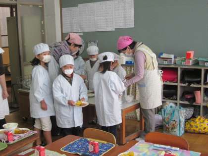 1年生が上手に給食を配っていました。半年でいろいろ成長しているなあと感心しました。