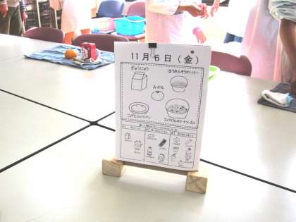 高学年は多目的室で給食を食べています。テーブルの上には,給食カレンダーが置いてあります。