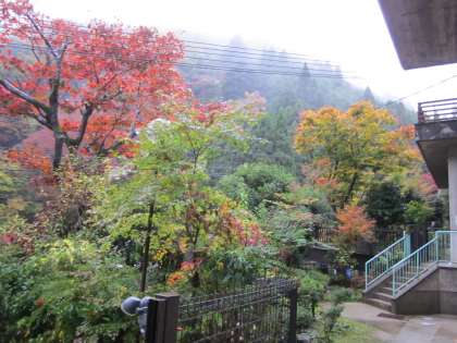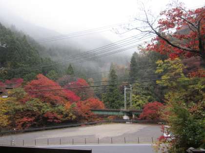 学校の周りは霧です。白い霧の中から美しい紅葉が見られます。