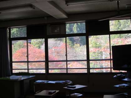 4年生教室の窓からは,〖額縁のような紅葉〗が見えていました。