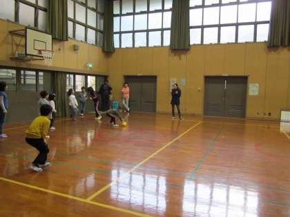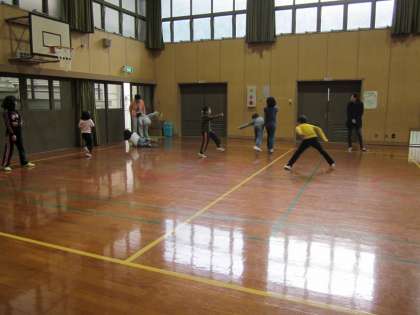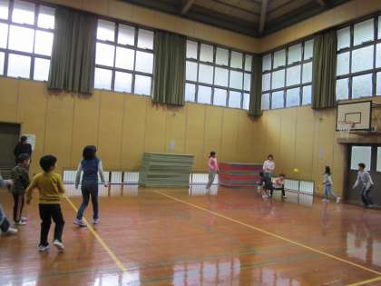 雨が降ったりやんだり…。グランドコンディションも悪いので,今日は終日体育館遊びです。