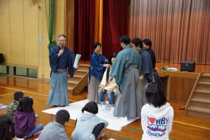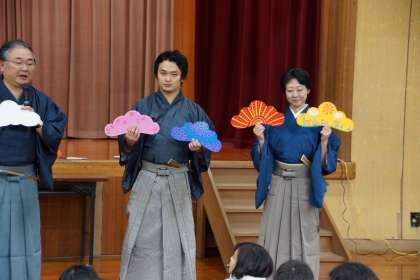 能装束の着付けは,担任の先生がモデルになりました。面をつけると非常に視野が狭くなるそうです。最後に,2月の公演で使用する老松づくりが宿題(?)に出ました。