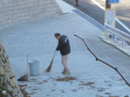 管理用務員さん,今朝はスロープの清掃をしています。
