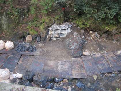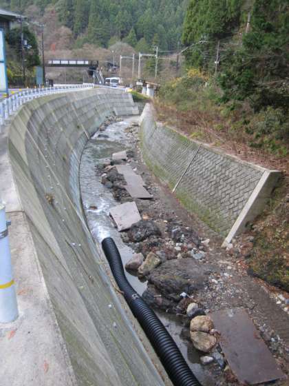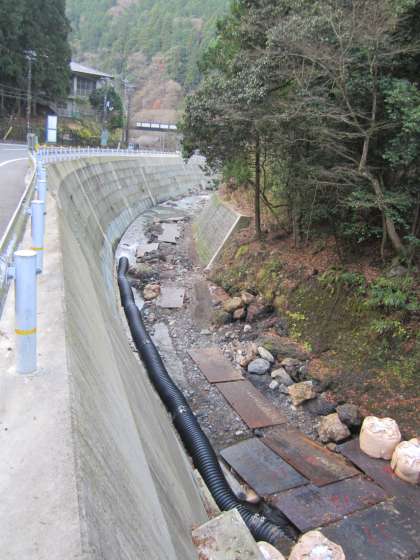 鞍馬川の水は,鉄板横の黒いパイプの中を通っています。