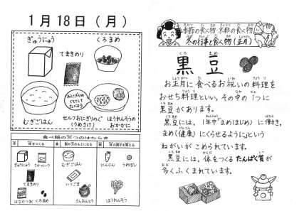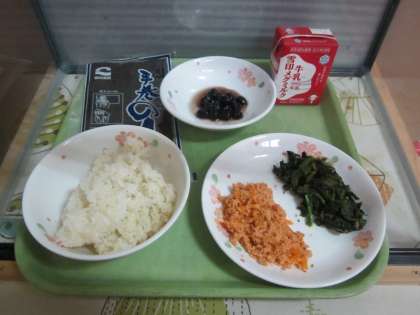 今日の給食は,麦ごはん・牛乳・セルフおにぎり(具・梅さけ)・ほうれん草のおかか煮・黒豆です。