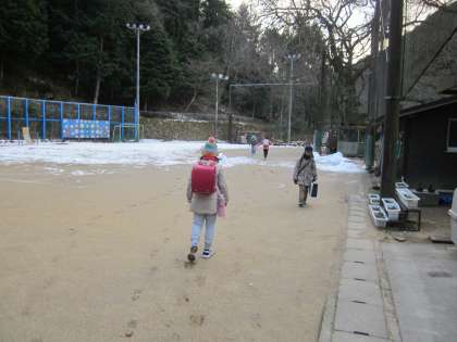 運動場のぬかるみに驚く鞍馬っ子です。(毎朝凍っているもので…。)