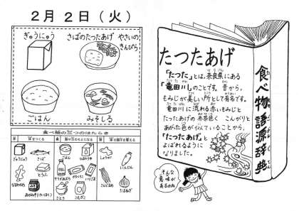 今日の給食に“竜田揚げ”があります。語源について「給食カレンダー」に載っています。